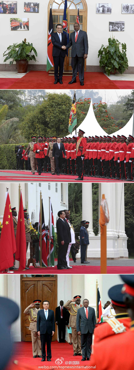 ????新華網(wǎng)北京5月10日電? 據(jù)新華社“新國際”微博報道,肯尼亞總統(tǒng)肯雅塔10日上午在國家宮為中國總理李克強(qiáng)舉行隆重歡迎儀式?,F(xiàn)場鳴放禮炮,軍樂隊(duì)奏兩國國歌。李克強(qiáng)檢閱了儀仗隊(duì)。