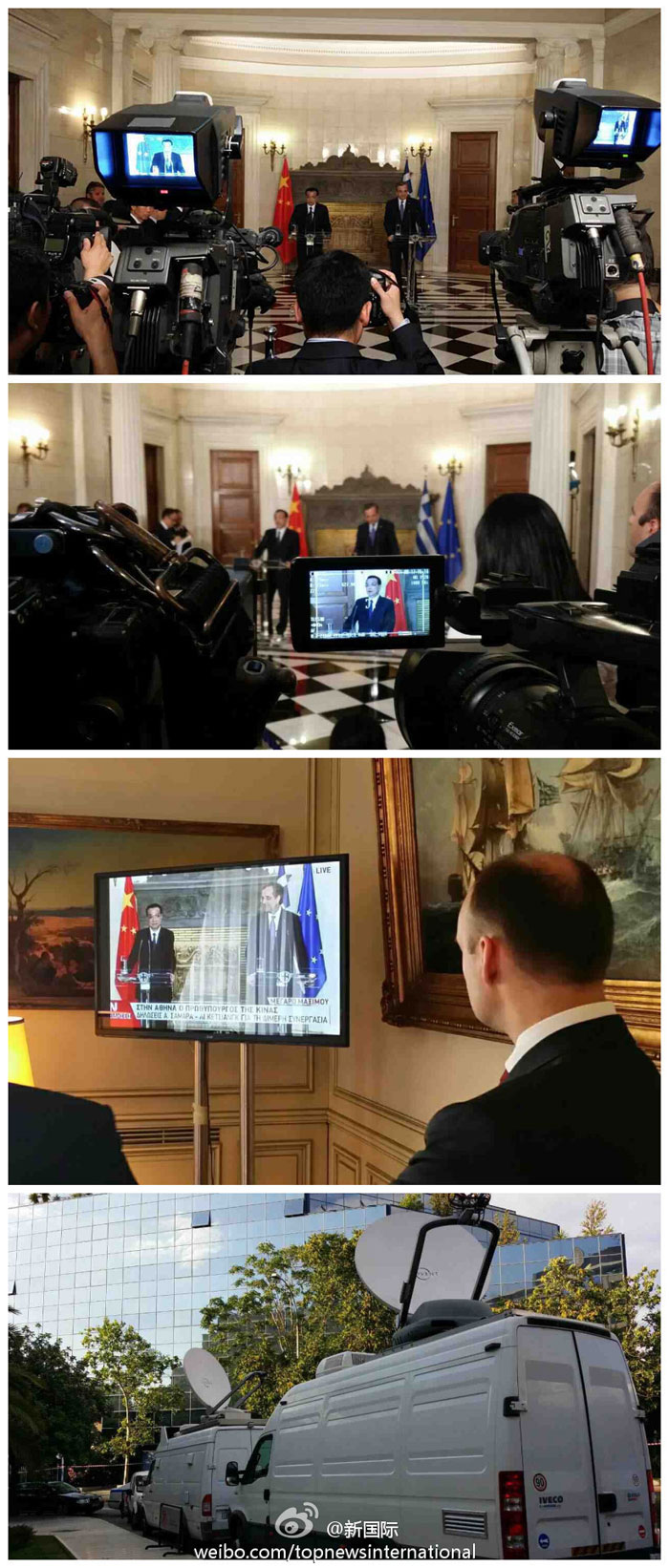 ??? 新華網北京6月20日電 據新華社“新國際”微博報道,19日,李克強總理抵達希臘開始正式訪問。希臘媒體極為關注中國總理的到訪,從機場的歡迎儀式到總理府會談,再到兩國總理共見記者,希臘媒體始終全程追隨。希臘國家電視臺等媒體還派出衛(wèi)星轉播車對所有活動進行全程直播。