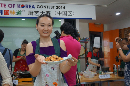 ????6月28日,駐華韓國文化院,2014“韓國味道”廚藝大賽現(xiàn)場。圖為獲勝選手沈振華和她的獲獎菜品。新華網(wǎng) 王俊景 攝