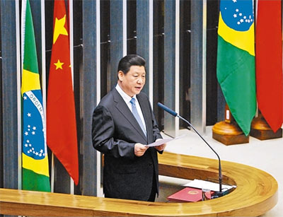 當(dāng)?shù)貢r(shí)間7月16日,國(guó)家主席習(xí)近平在巴西國(guó)會(huì)發(fā)表演講。新華社記者 劉建生攝