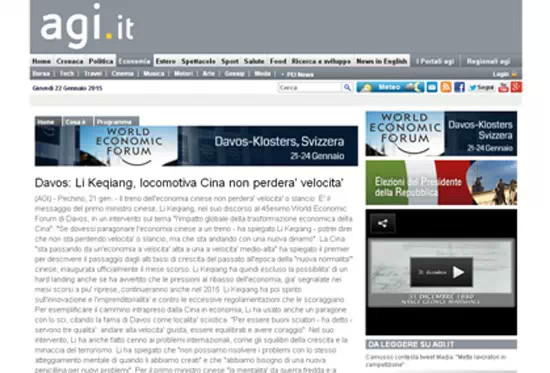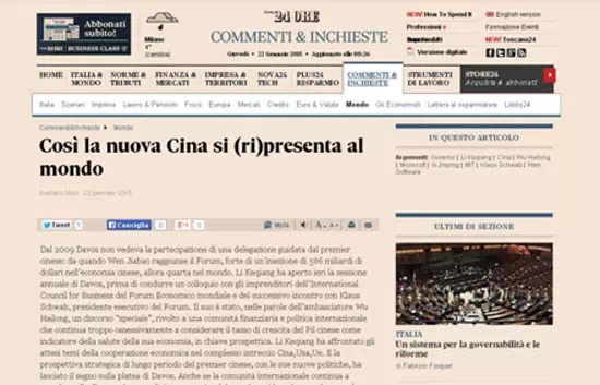 意大利24小時(shí)太陽(yáng)報(bào)1月22日發(fā)表題為《中國(guó)重新向世界自我介紹》的評(píng)論性文章,介紹了李克強(qiáng)在世界經(jīng)濟(jì)論壇上的講話。文章稱,雖然國(guó)際社會(huì)一直在用西方國(guó)家的種族主義中心心態(tài)以及舊的眼光看待中國(guó),中國(guó)國(guó)務(wù)院總理李克強(qiáng)的長(zhǎng)期戰(zhàn)略眼光和他的新政策還是給達(dá)沃斯的聽眾們留下深刻印象。