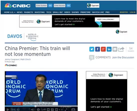 其中,美國(guó)CNBC新聞臺(tái)1月22日刊文,以“火車動(dòng)能不減”為題,形容李克強(qiáng)總理提到的不會(huì)“硬著陸”的中國(guó)經(jīng)濟(jì)。李克強(qiáng)總理在致辭中以列車形容中國(guó)經(jīng)濟(jì)“新常態(tài)”,指出,中國(guó)經(jīng)濟(jì)的列車不會(huì)因“有所放緩而失速,反而會(huì)跑得更穩(wěn)健”。文中還援引李克強(qiáng)在會(huì)上的發(fā)言,指出中國(guó)將“堅(jiān)定不移地推動(dòng)結(jié)構(gòu)性改革”,推動(dòng)自貿(mào)區(qū)、國(guó)際間經(jīng)濟(jì)合作的建設(shè)與發(fā)展。