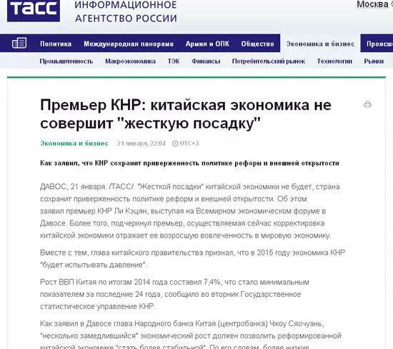 塔斯社發(fā)表了一篇名為《中國(guó)總理:中國(guó)經(jīng)濟(jì)不會(huì)硬著陸》的文章。文中指出,李克強(qiáng)和中國(guó)央行行長(zhǎng)周小川在達(dá)沃斯論壇期間均表示,中國(guó)將深化改革開放,漸緩的增長(zhǎng)速度有利于中國(guó)經(jīng)濟(jì)的轉(zhuǎn)型。在3月份舉行的中國(guó)兩會(huì)上,中國(guó)政府將提出新的經(jīng)濟(jì)發(fā)展規(guī)劃,速度肯定不會(huì)是北京追求的首要目標(biāo)。