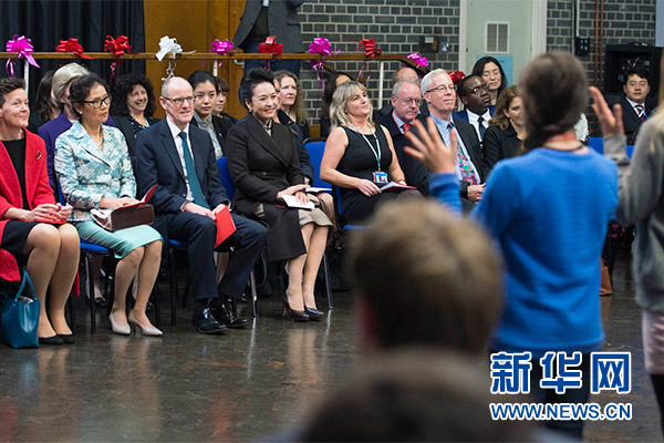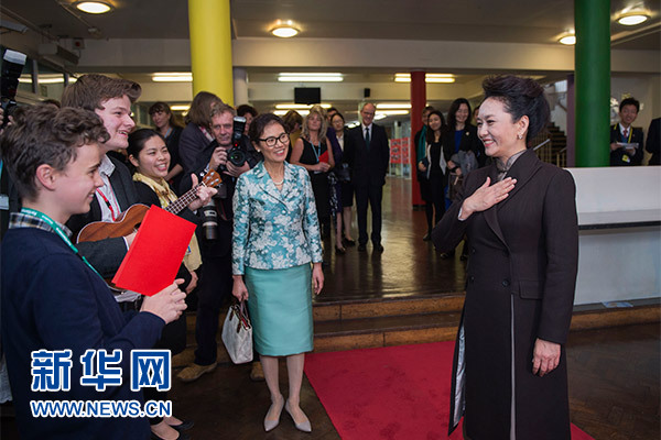 在英國(guó)教育部國(guó)務(wù)大臣吉布、學(xué)校校長(zhǎng)等陪同下,彭麗媛觀看學(xué)生們用中文進(jìn)行的才藝表演,參觀學(xué)校成果展,觀摩中文課,與女學(xué)生們互動(dòng)交流,并向?qū)W校贈(zèng)送中國(guó)文化及漢語(yǔ)學(xué)習(xí)類圖書(shū)及音像制品。