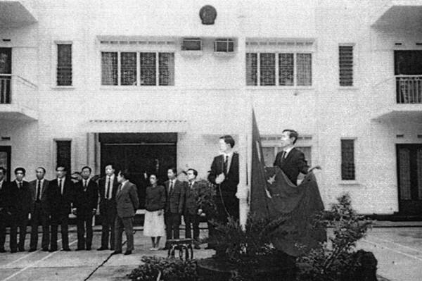 1990年10月15日,中國(guó)駐新加坡大使館舉行開(kāi)館升旗儀式。新華社記者李永明攝
