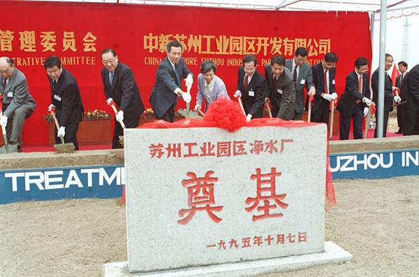 為了加快蘇州工業(yè)園區(qū)的建設(shè),中新兩國(guó)政府聯(lián)合協(xié)調(diào)理事會(huì)第二次會(huì)議1995年10月7日在江蘇蘇州舉行。新加坡副總理李顯龍、中國(guó)副總理李嵐清主持了這次會(huì)議。圖為1995年10月7日會(huì)議代表參加蘇州凈水廠的奠基儀式,左三為李嵐清,左四為李顯龍。