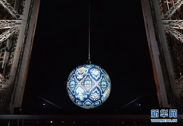11月23日,在法國巴黎,一個名為“地球危機(jī)”的大圓球懸掛在埃菲爾鐵塔上。