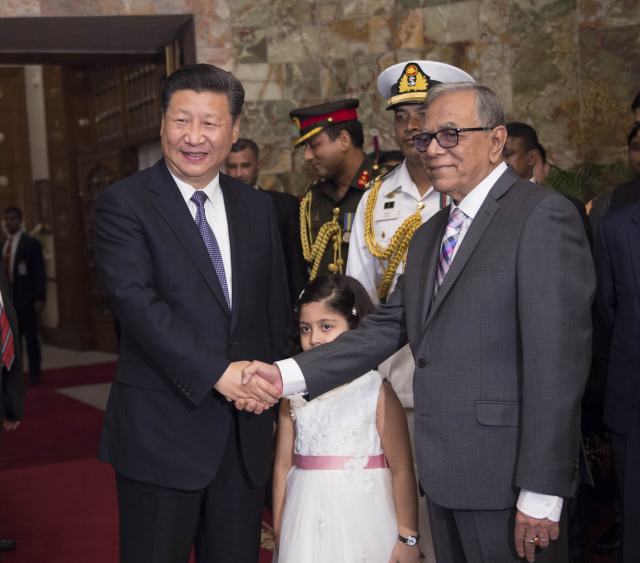 【中孟兩國(guó)友誼代代相傳再寫佳話】14日中午,習(xí)近平主席抵達(dá)孟加拉國(guó)首都達(dá)卡,在機(jī)場(chǎng)受到熱烈歡迎。哈米德總統(tǒng)親自到機(jī)場(chǎng)迎接,并帶來自己的小孫女向習(xí)主席獻(xiàn)上鮮花。無獨(dú)有偶,1956年,周恩來總理訪問孟加拉國(guó)時(shí),孟加拉國(guó)國(guó)父拉赫曼帶著女兒向周總理獻(xiàn)花。當(dāng)年那位獻(xiàn)花的小姑娘正是現(xiàn)在的孟加拉國(guó)總理哈西娜。習(xí)主席深情地對(duì)孟加拉國(guó)領(lǐng)導(dǎo)人說:“這是中孟兩國(guó)友誼代代相傳的佳話?!?/p>