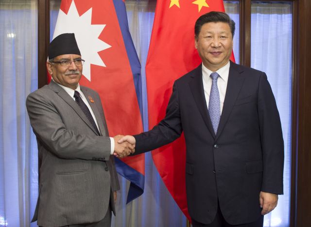 圖為10月15日,國(guó)家主席習(xí)近平在印度果阿會(huì)見尼泊爾總理普拉昌達(dá)。(新華社記者謝環(huán)馳攝)
