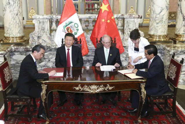 11月21日,國家主席習近平在利馬同秘魯總統(tǒng)庫琴斯基舉行會談。會談后,兩國元首見證《中華人民共和國政府與秘魯共和國政府2016年至2021年共同行動計劃》等文件的簽署。(新華社記者 龐興雷 攝)