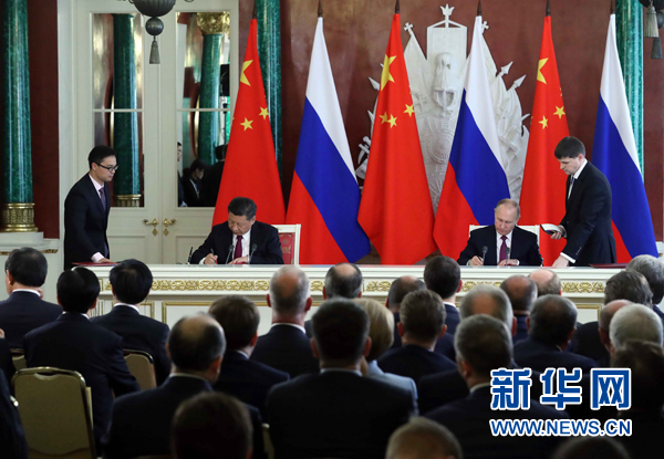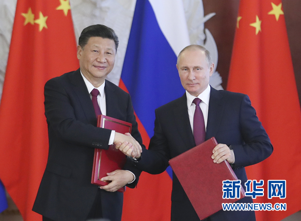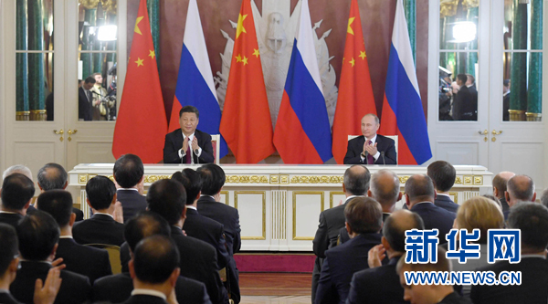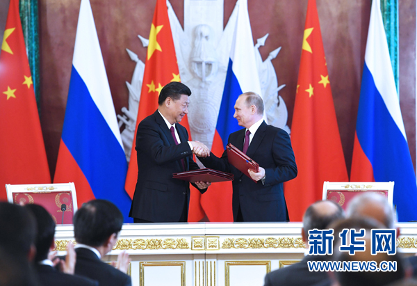 7月4日,國家主席習近平在莫斯科克里姆林宮同俄羅斯總統(tǒng)普京舉行會談。會談后,兩國元首簽署了《中華人民共和國和俄羅斯聯(lián)邦關于進一步深化全面戰(zhàn)略協(xié)作伙伴關系的聯(lián)合聲明》《中華人民共和國和俄羅斯聯(lián)邦關于當前世界形勢和重大國際問題的聯(lián)合聲明》,批準了《〈中華人民共和國和俄羅斯聯(lián)邦睦鄰友好合作條約〉實施綱要(2017年至2020年)》并見證了《中華人民共和國外交部和俄羅斯聯(lián)邦外交部關于朝鮮半島問題的聯(lián)合聲明》以及經貿、農業(yè)、能源、基礎設施建設、金融、文化、創(chuàng)新、媒體、信息網絡、檢驗檢疫等領域多項雙邊合作文件的交換。新華社記者 饒愛民 攝