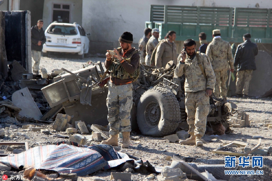 當(dāng)?shù)貢r間22日,阿富汗坎大哈,當(dāng)?shù)匾惶幘炜偛吭庥鲎詺⑹狡囌◤椧u擊,造成至少6名警察死亡,4人受傷。圖為阿富汗安全官員檢查現(xiàn)場。(圖片來源:東方IC)