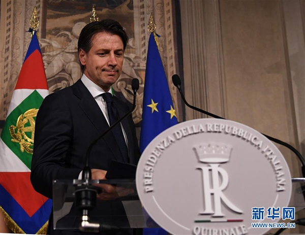 5月27日,在意大利首都羅馬,意新任總理孔特發(fā)表講話。據(jù)當(dāng)?shù)孛襟w報道,孔特27日晚間與總統(tǒng)馬塔雷拉會面并提交擬定的內(nèi)閣成員名單時,馬塔雷拉否決了由意大利聯(lián)盟黨和五星運(yùn)動力推的持疑歐立場的經(jīng)濟(jì)學(xué)家保羅·薩沃納出任財政部長。孔特向總統(tǒng)提出放棄組閣任務(wù)請求,請求得到總統(tǒng)確認(rèn)。新華社發(fā)(阿爾貝托·林格里亞攝)