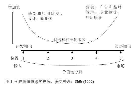 全球價值鏈構(gòu)建了一個跨國或者跨地區(qū)不同公司實現(xiàn)不同的工序和商業(yè)功能的生產(chǎn)架構(gòu)(Grossman和Rossi-Hansberg,2012)。這個架構(gòu)是“生產(chǎn)性的(價值增長的)通向并且支持最終使用的順序” (Sturgeon 2001)。微笑曲線提出了一種不同的解構(gòu)國際貿(mào)易的方法。有些國家專業(yè)化“生產(chǎn)”知識與研發(fā),而另一些國家專業(yè)化于制造業(yè),或者品牌營銷。因此,一個產(chǎn)品的增加值不再是完全屬于某一個國家,而是整條價值鏈上的參與者都可以分一杯羹。在為最終產(chǎn)品貢獻價值的生產(chǎn)工序的鏈條上(既,產(chǎn)品的價值鏈),一般的工序鏈條開始于基礎(chǔ)和應(yīng)用研究與設(shè)計。這些研究與設(shè)計活動往往會帶來新的想法、技術(shù)、新產(chǎn)品設(shè)計和新的生產(chǎn)工藝。這個工序鏈條下一環(huán)節(jié)是商業(yè)化這些研究成果,如專利和知識產(chǎn)權(quán)(想法、論文、知識等);再下一環(huán)節(jié)是資源的獲取和材料的生產(chǎn)(包括農(nóng)業(yè)產(chǎn)品),零部件的生產(chǎn)和產(chǎn)品的組裝,以及最后環(huán)節(jié)的營銷、廣告、品牌管理、物流、商業(yè)服務(wù)和售后服務(wù)。另外,價值鏈在文獻中的定義是超出中間品貿(mào)易的,它強調(diào)在不同環(huán)節(jié)上領(lǐng)先企業(yè)與供應(yīng)商之間的權(quán)力架構(gòu) (Milberg,2004)。