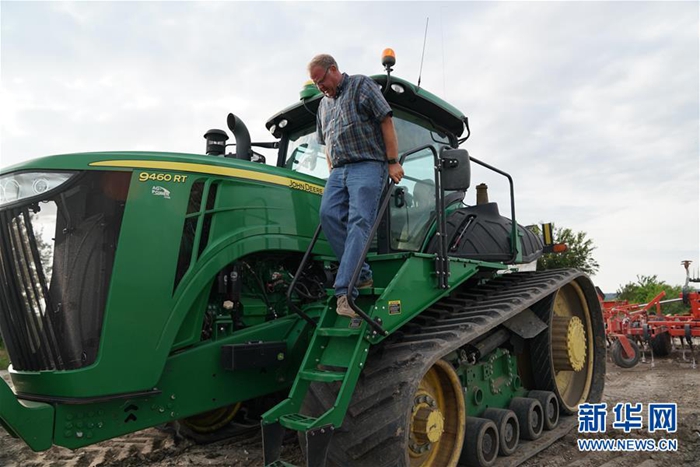 6月10日,在位于美國中部密蘇里州的塔基奧,密蘇里農(nóng)會會長布萊克·赫斯特從一輛拖拉機(jī)上下來。新華社記者 劉杰 攝