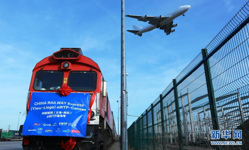 2019年10月25日,滿載著82個(gè)標(biāo)準(zhǔn)箱的中歐班列(義烏—列日)“世界電子貿(mào)易平臺(tái)(eWTP)菜鳥號(hào)”首趟列車抵達(dá)比利時(shí)列日物流多式聯(lián)運(yùn)貨運(yùn)場站。新華社記者 潘革平 攝